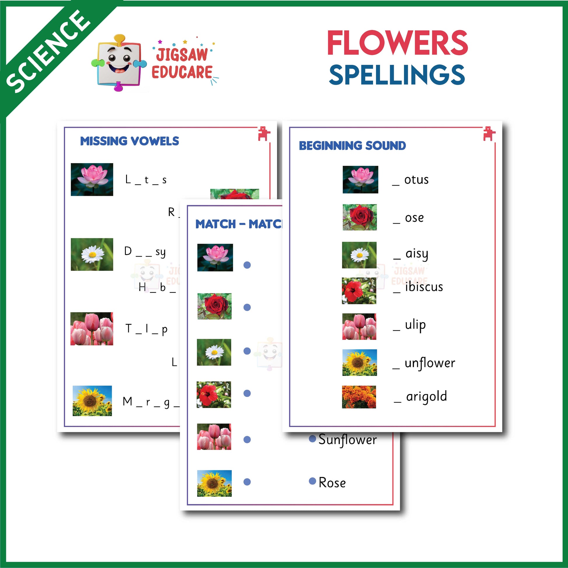 This 3-sheet worksheet pack helps kids master the spelling of common flowers through engaging activities: