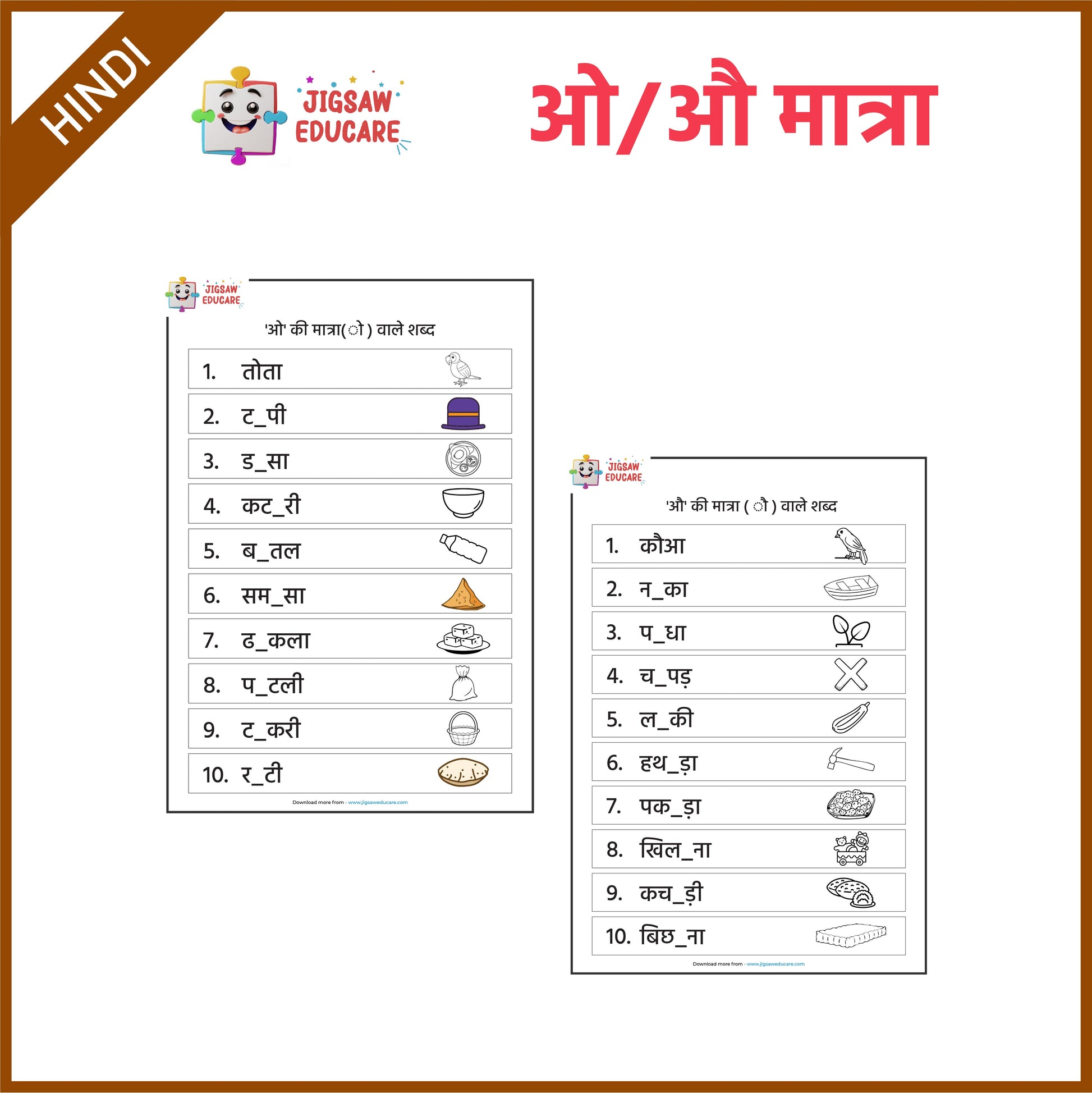 Help your child master the o (ओ) and ao (औ) matras with this digital download worksheet set! These 2 practice sheets include fun activities to identify, read, and write words using these matras correctly. Clear examples and engaging exercises make learning interactive and easy to remember.